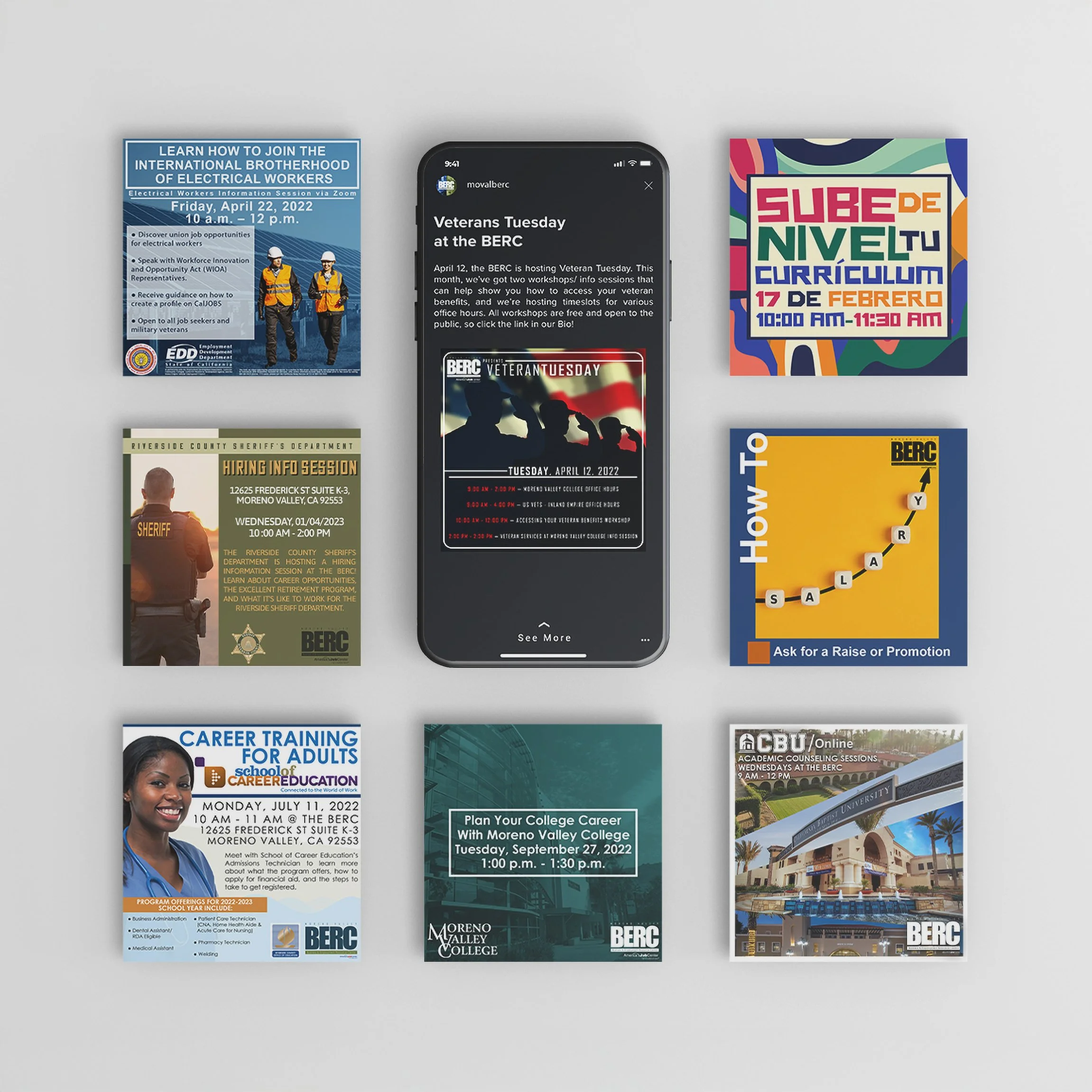 Through my position as a Marketing Associate and Graphic Designer, I was tasked with managing the center’s social media channels in order to increase attendance and awareness. As a result, a large number of flyers and social media posts were created in order to provide eye-catching visuals that intended to stand out amidst the endless scrolling algorithms while simultaneously communicating information about the events by using photos, color, composition, and clear visual hierarchy. Through these implementations during my tenure with the city, attendance at BERC events grew consistently from 2022-2024.